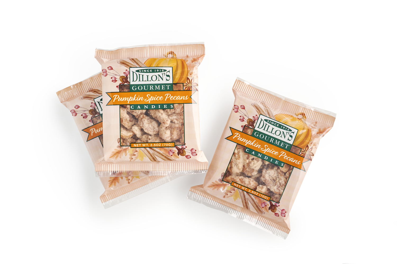 Praline pecans consist of fancy pecans coated with a buttery, praline candy, a traditional confection of the coastal South. Some proclaim Dillon’s Cinnamon Pecans to be “cinful”, but these fresh-from-the-tree pecans, covered in a candy infused with cinnamon, taste quite heavenly. Pumpkin Spice Pecans in a convenient 2.5 oz package. Infused with the warm, comforting flavors of cinnamon, nutmeg, brown sugar, and ginger, these pecans offer the perfect balance of sweetness and spice. Made with simple, high-quality ingredients, they deliver a rich, satisfying taste that embodies the essence of fall.